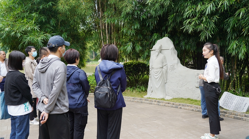 參觀的第二站是竹園,一走進(jìn)竹園,“竹未出土先有節(jié)”這句漢白玉雕刻的詩詞在郁郁蔥蔥的竹林掩映下十分醒目。園區(qū)分為“頌竹”“品竹”“聽竹”“知竹”,完美地將“景”與風(fēng)清氣正的“廉”融合,構(gòu)成“半山半水半竹林”的雅致景色。在參觀過程中,講解員向大家訴說著古代清官廉吏的典故,感受著先輩們剛正廉明的優(yōu)秀品質(zhì),也體會到古往今來的“廉竹精神”。