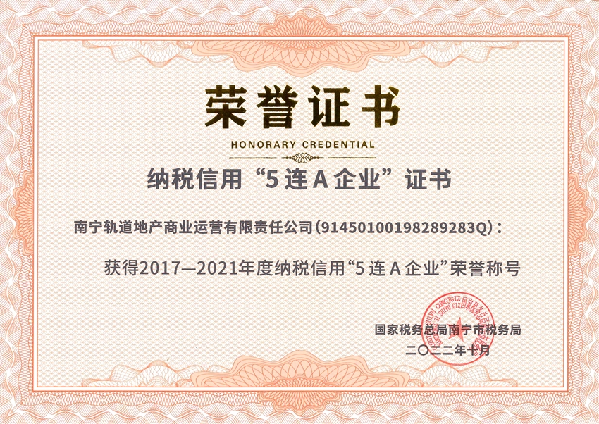 近日,軌道地產(chǎn)商業(yè)公司榮獲國家稅務(wù)總局南寧市稅務(wù)局授予的納稅信用“5連A”企業(yè)榮譽(yù)稱號。獲此殊榮,不僅是稅務(wù)機(jī)關(guān)對軌道地產(chǎn)商業(yè)公司稅務(wù)管理工作的充分肯定,更為軌道地產(chǎn)商業(yè)公司走上高質(zhì)量發(fā)展之路提供了強(qiáng)有力的支撐。