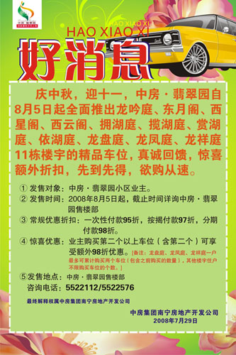 慶中秋,迎十一,中房·翡翠園自8月5日起全面推出龍吟庭、東月閣、西星閣、西云閣、擁湖庭、攬湖庭、賞湖庭、依湖庭、龍盤庭、龍鳳庭、龍祥庭11棟樓宇的精品車位,真誠(chéng)回饋,驚喜額外折扣,先到先得,欲購(gòu)從速。